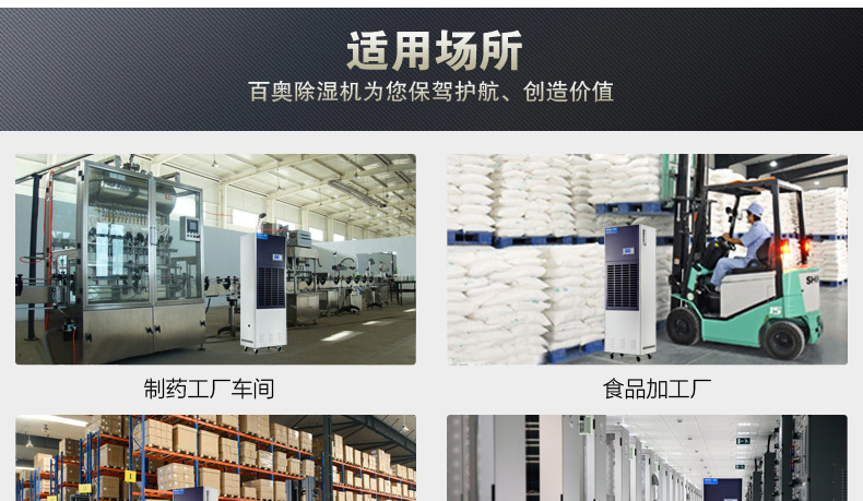 空气干燥:百奥工业除湿机广泛应用于贵重物品仓库、制药、食品、电子、皮革、鞋业、家具、印刷制品、化工、烟草等诸多行业。使物品避免了因潮湿、霉变带来的重大损失。产品适用面积大,特别适用于大型车间及仓库使用
